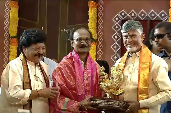 Andhra Pradesh Chief Minister Nara Chandrababu Naidu presented the Kala Ratna Award to senior journalist and writer Bhagiratha. Chandrababu Naidu, who attended the Ugadi Awards ceremony held at Tummalapalli Kalakshetram in Vijayawada on March 30 as the chief guest, presented the Kala Ratna Award to Bhagiratha and congratulated him.