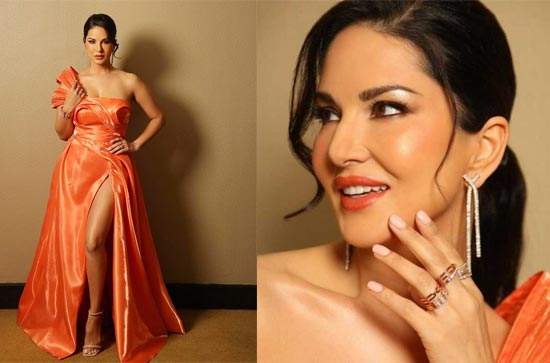 Another reason behind her popularity is her stunning looks and charming personality. Here's Sunny Leone who's looking drop dead gorgeous in this orange dress, in all her glory and charm. She is a terrific lady who continues to impress audiences like anything and her sex appeal makes it all the more special.