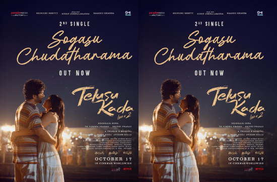 Following the chart-topping success of its first single, "Mallika Gandha," the team behind Telusu Kada has unveiled the film's second track, "Sogasu Chudatharama." The peppy romantic number was launched by actress Nayanthara and features the lead pair, Star Boy Siddu Jonnalagadda and Srinidhi Shetty.