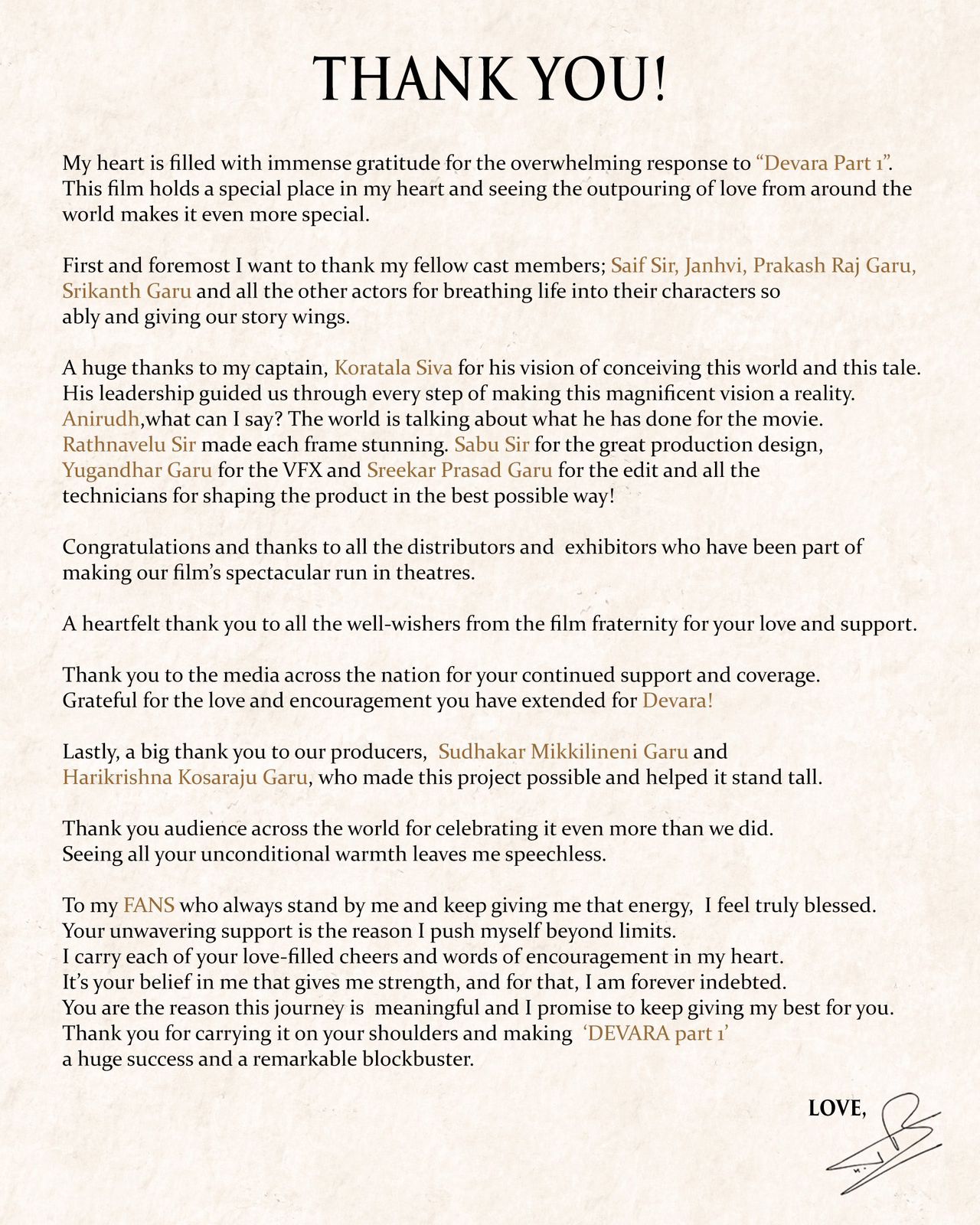 "Congratulations and thanks to all the distributors and exhibitors who have been part of making our film's spectacular run in theatres. A heartfelt thank you to all the well-wishers from the film fraternity for your love and support. Thank you to the media across the nation for your continued support and coverage. Grateful for the love and encouragement you have extended for Devara. Lastly, a big thank you to our producers, Sudhakar Mikkilineni Garu and Harikrishna Kosaraju Garu, who made this project possible and helped it stand tall. Thank you audience across the world for celebrating it even more than we did. Seeing all your unconditional warmth leaves me speechless. To my FANS who always stand by me and keep giving me that energy, I feel truly blessed. Your unwavering support is the reason I push myself beyond limits. I carry each of your love-filled cheers and words of encouragement in my heart. It's your belief in me that gives me strength, and for that, I am forever indebted. You are the reason this journey is meaningful and I promise to keep giving my best for you. Thank you for carrying it on your shoulders and making 'DEVARA part 1' a huge success and a remarkable blockbuster."